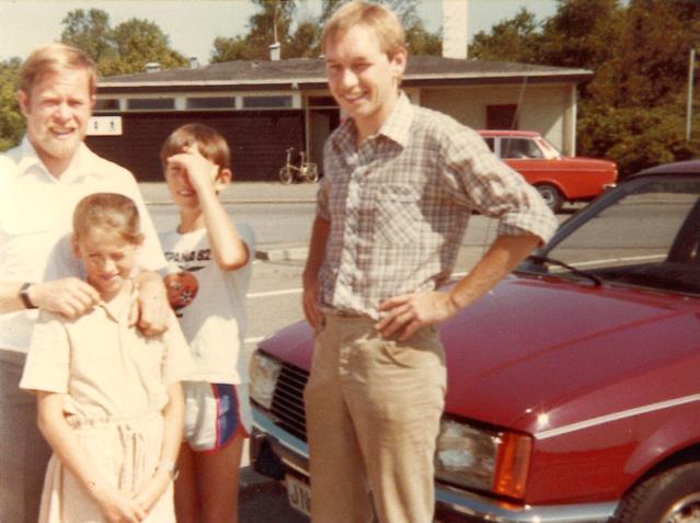 Niels Christoffersen – 2. generation i Santax Medico – ses her til venstre sammen med børnene Ann-Charlotte og Ole, sidstnævnte er i dag administrerende direktør i virksomheden. Til højre teknisk direktør Jens Fuursted, som skulle afsted til sin første kongres med firmaet. Han har i dag været ansat i 45 år