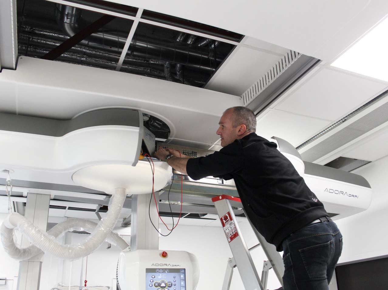 Installation af nyt udstyr er en af kerneopgaverne hos Santax Medico. Her er røntgentekniker Henrik D. Poulsen i gang med en installation på røntgenafdelingen på Regionshospitalet Gødstrup, før det nye hospital blev taget i brug i 2021