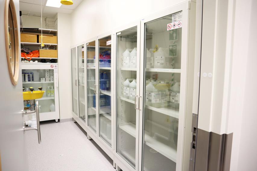 Sprit, sæbe og kemi til vaskemaskinerne opbevares i et separat, brandsikret rum.
