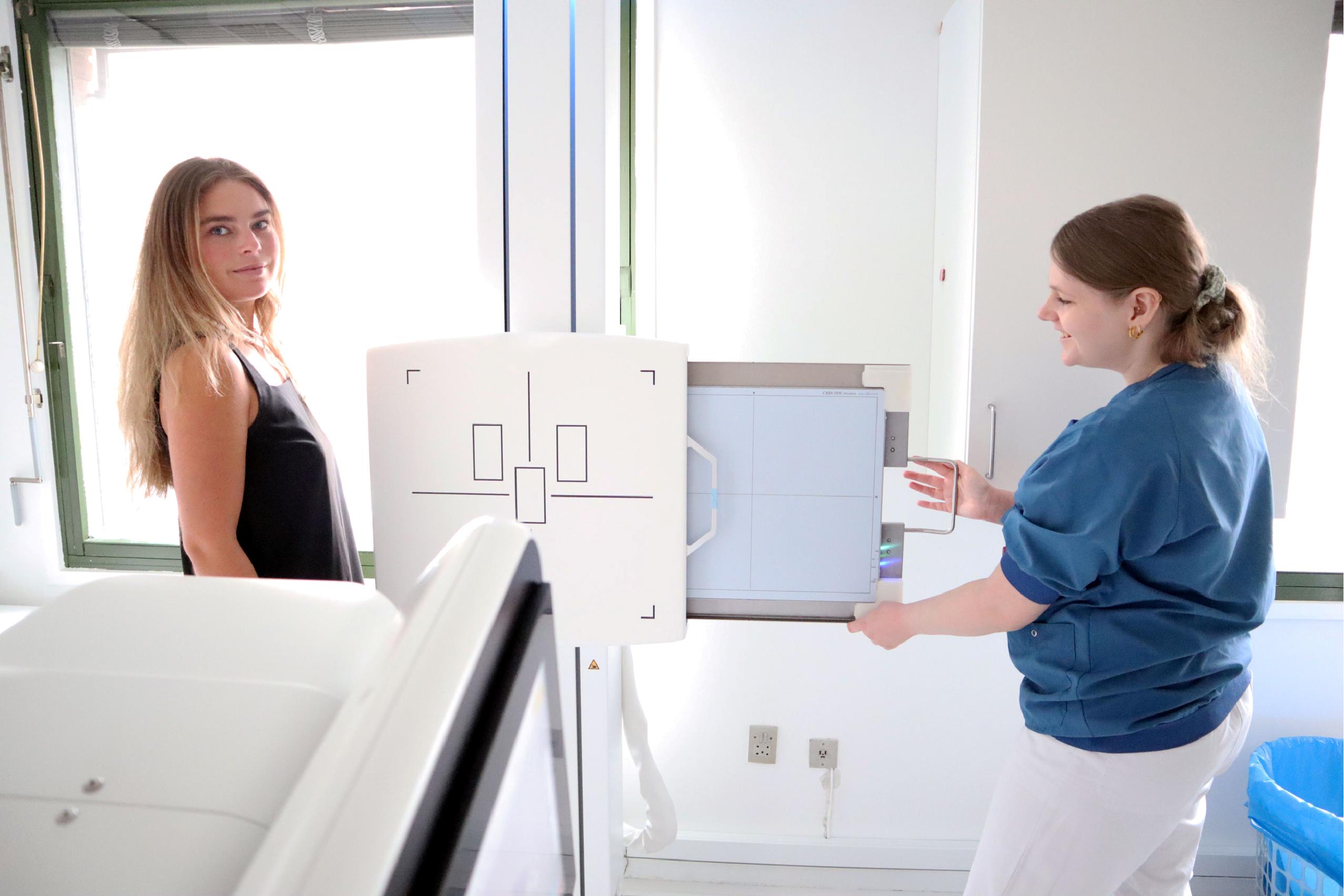 På billederne er det administrativ teamleder Maria Ramkilde, der agerer patient, mens radiograf Nadja Djurnø viser det nye røntgenudstyr.