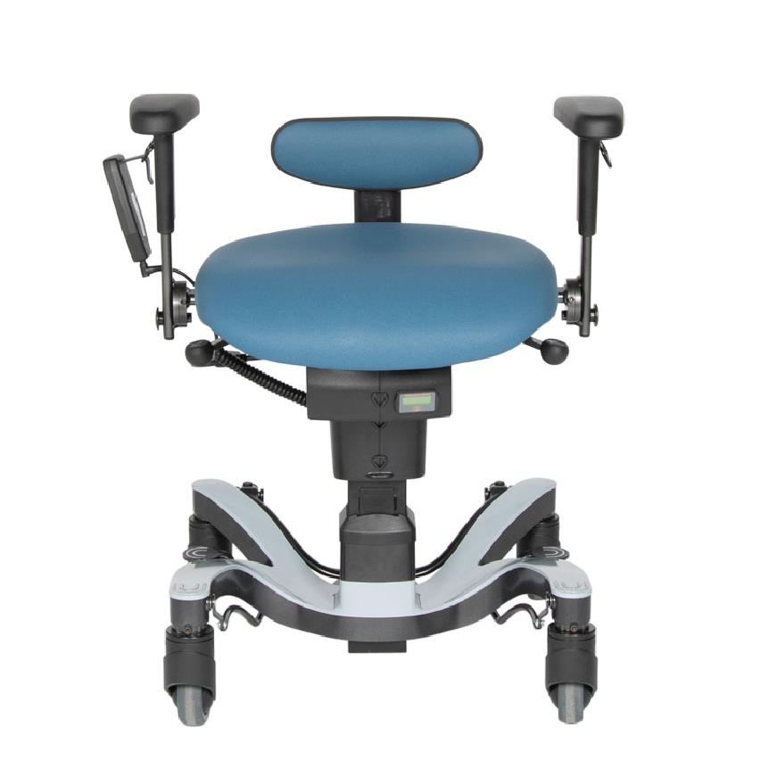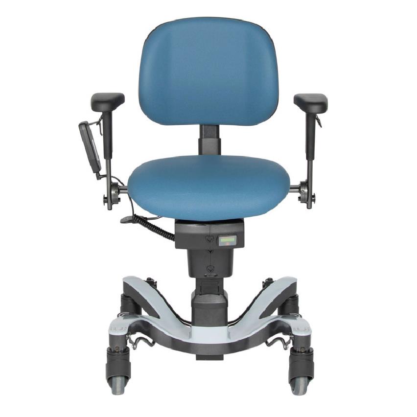 Turn+ thoraxstolen giver personalet ergonomiske arbejdsstillinger. Alle hjul på stolen kan låses på én gang ved hjælp af centralbremsen. Radiograferne kan betjene bremsen med foden, uden de skal bøje sig ned. Hæve/sænke-funktionen betjener de via en fjernbetjening med ledning. Hæve/sænke-funktionen er elektrisk og gør det muligt at finjustere højden meget præcist. Afdelingen har fundet en god rutine for opladning af stolen, så den ikke løber tør for strøm under en undersøgelse.