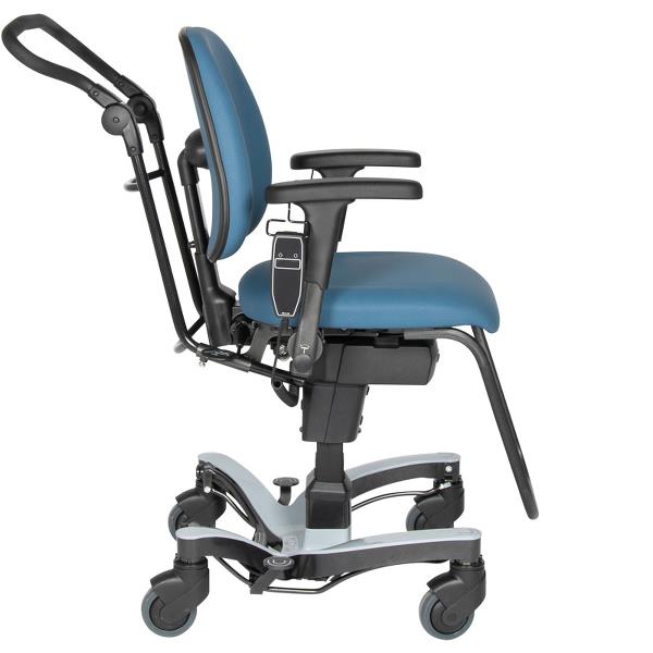 - Stolen sparer tid og letter mødet med patienten, da stolen kan gøres klar før patienten kommer ind. Stolen flyttes og placeres nemt og hurtigt over til apparaturet med skubbebøjlen.