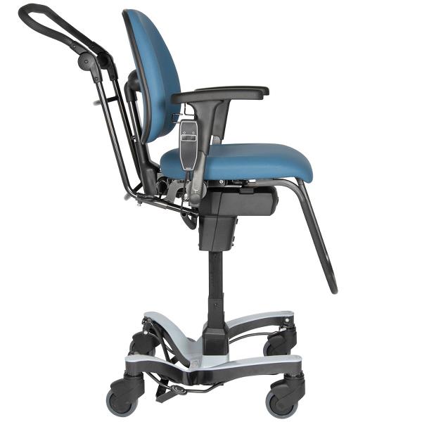 - Hurtig placering af patienten i en sikker og låst base. Det er nemt at flytte og placere patienten ift. undersøgelsesapparatet, da stolen har letløbende hjul, fodbremse og skubbebøjle