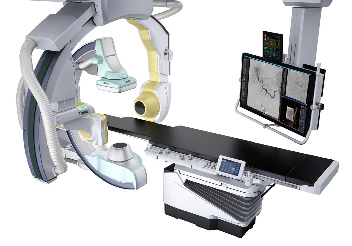 Shimadzu Trinias Biplan er velegnet til udførelse af alle hjerte-kar-indgreb. Den gulvmonterede C-bue har både tværgående og langsgående bevægelser, hvilket sikrer, at patientens hoved altid er let tilgængeligt. Den loftmonterede C-bue roterer omkring en loftaksel og kan positioneres med et tryk på en knap på hhv. højre eller venstre side af patienten. Således kan C-buen let og hurtigt positioneres.